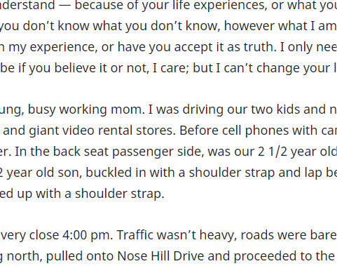 Just an everyday Mom on a trip to the store with a car-full of kids. When starting into a turn an approaching car shears off the front of her vehicle.